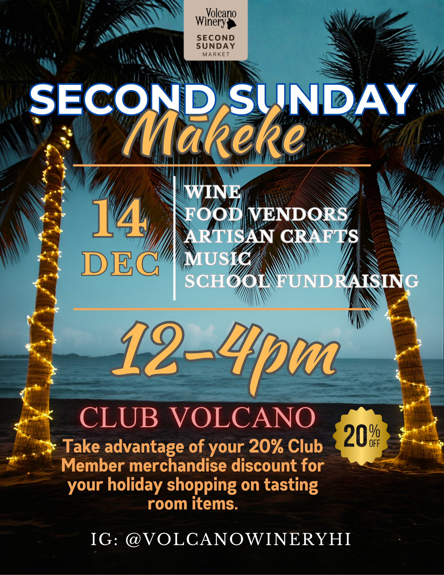 Come join us for wine, food, live music, and Artisan crafts at the Volcano Winery! Held every second Sunday of the month from 12pm-4pm.