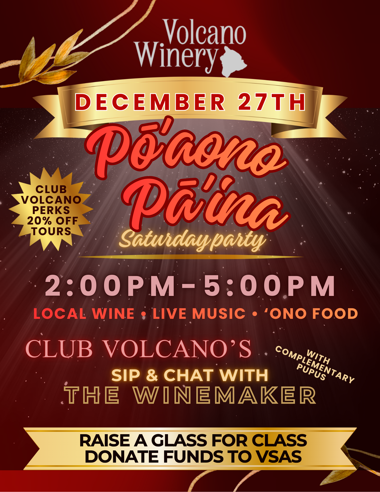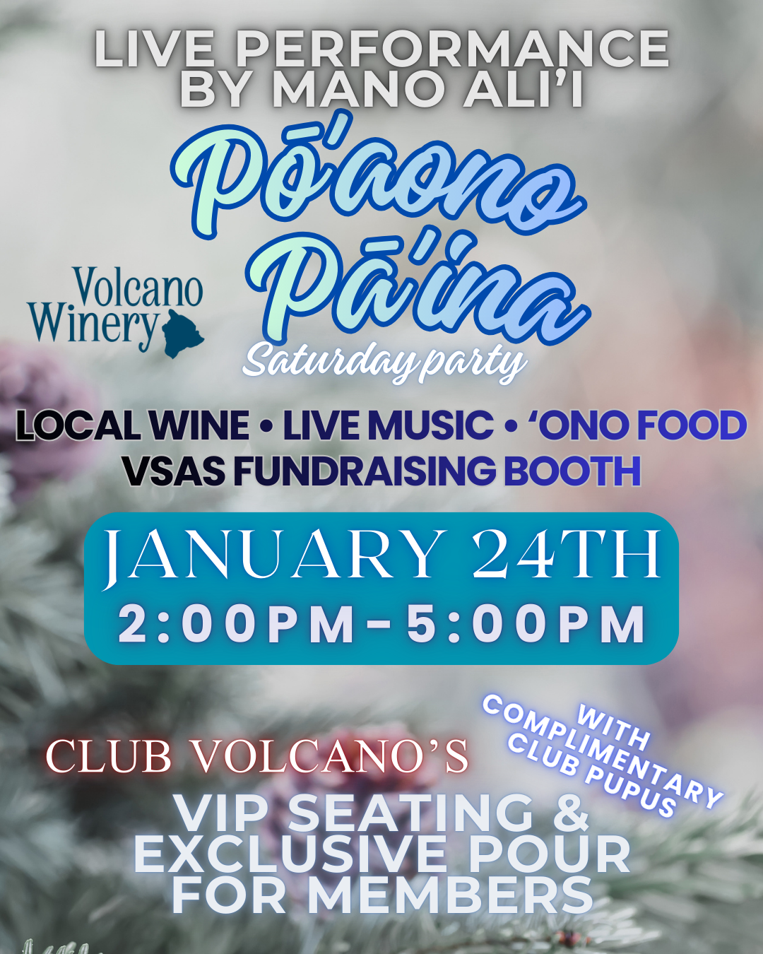 We are excited to announce our monthly Pā'ina for all to enjoy! We will be offering wine club members a exclusive taste of the wine maker's choice pick of the season during these events. If you are interested in joining our club 'ohana you can sign up anytime! Subscribe to receive 3 bottles quarterly! No sign up fee and cancelation fees. Minimum of two 3 bottle installments are required. See Club Volcano for more information or contact any member of our hui (team).