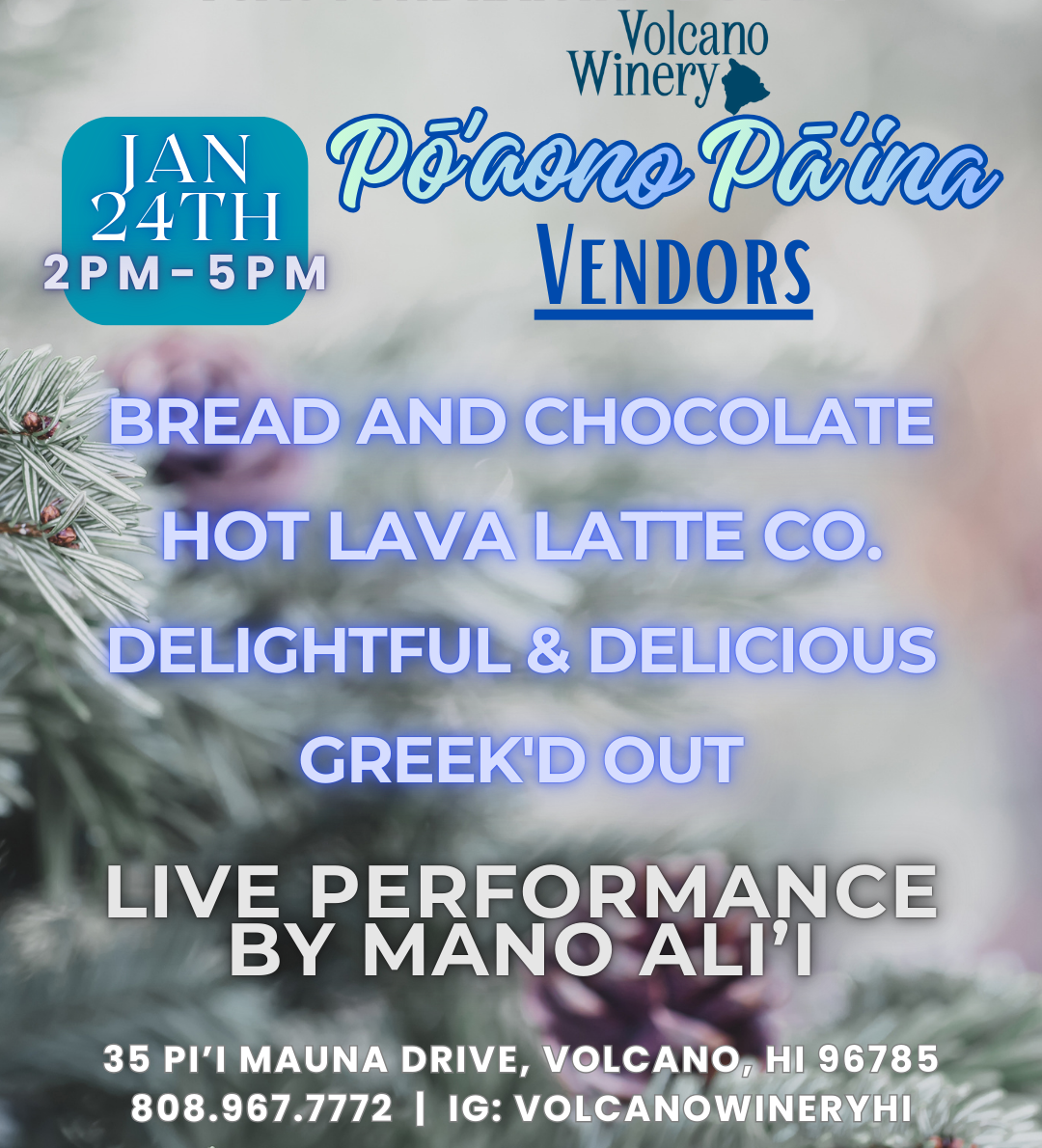 Come join us at Volcano Winery for wine, food, live music, and artisan crafts! This community gathering is held every second Sunday of the month from 12pm–4pm and is the perfect way to kick off the year.