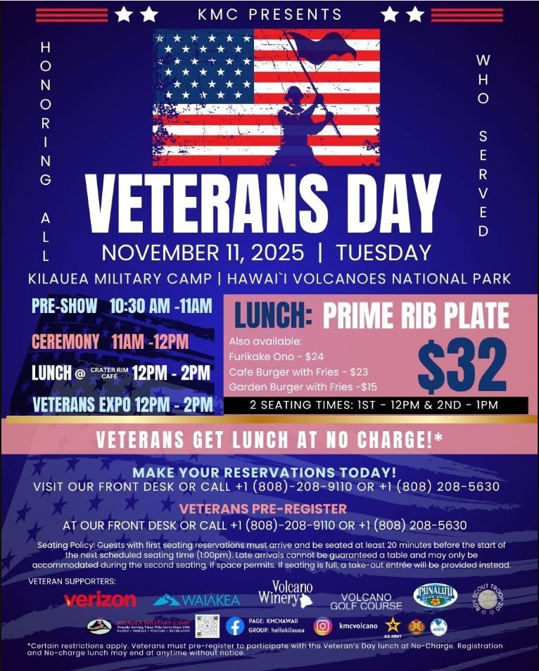 If you are joining the Veterans Day ceremony Volcano Winery will be near the flag pole at the KMC- Kilauea Military Camp within the National Park on Monday, November 11th. Come sample some of our locally made wine while we honor all who has served our nation.