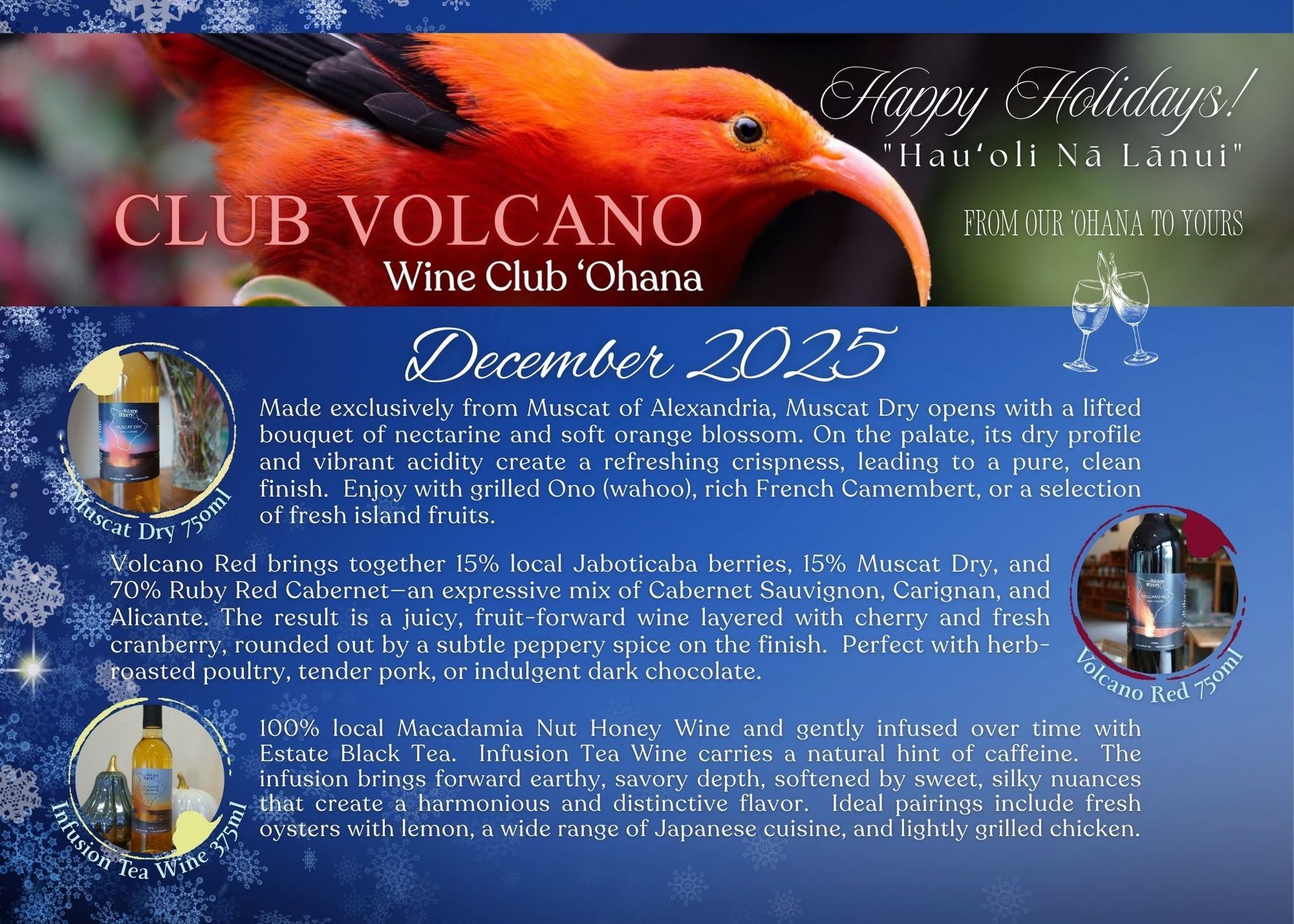 We are excited to announce our monthly Pā'ina for all to enjoy! We will be offering wine club members a exclusive taste of the wine maker's choice pick of the season during these events. If you are interested in joining our club 'ohana you can sign up anytime! Subscribe to receive 3 bottles quarterly! No sign up fee and cancelation fees. Minimum of two 3 bottle installments are required. See Club Volcano for more information or contact any member of our hui (team).